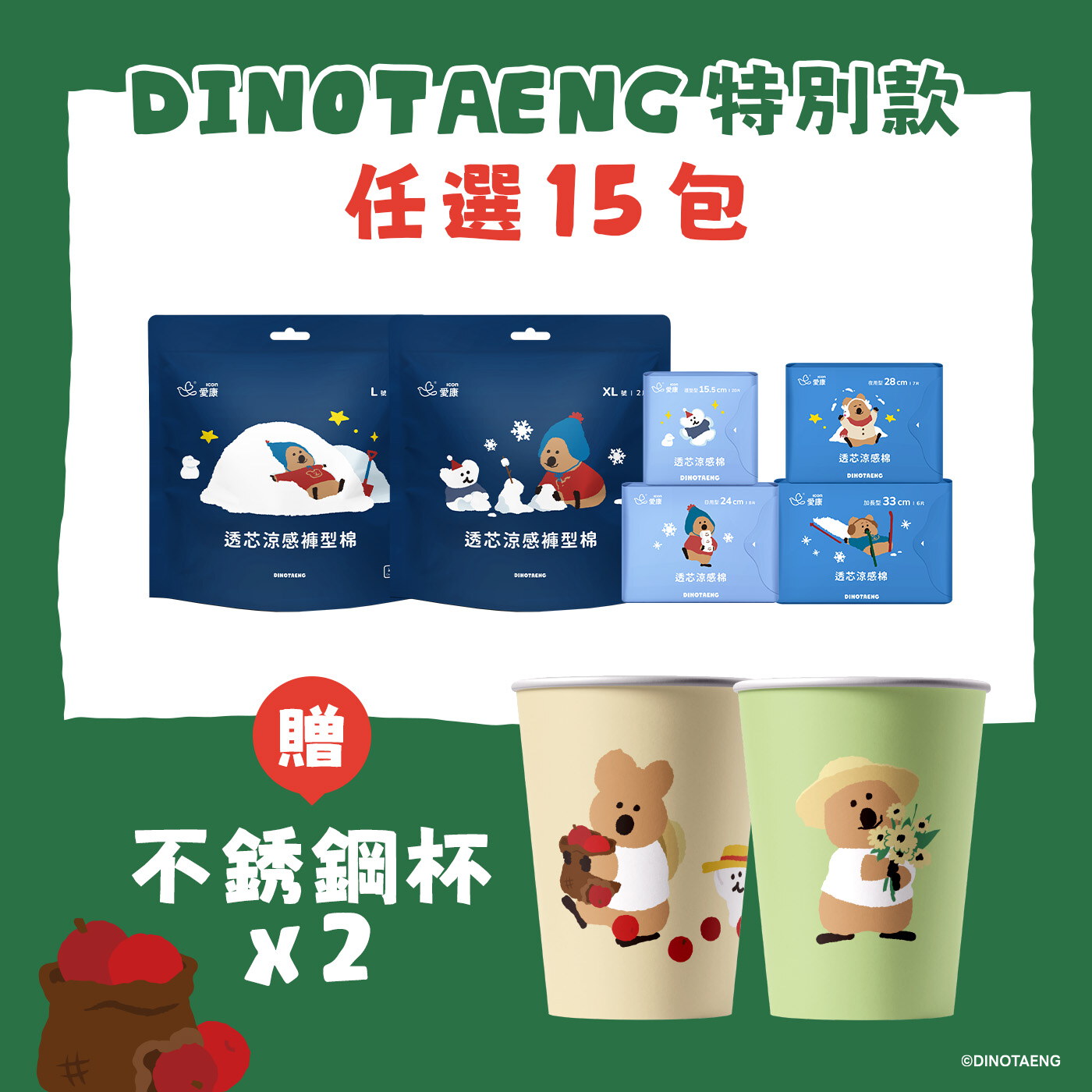 【DINOTAENG特別款】透芯涼感棉/褲型棉15包 (贈)不鏽鋼杯(2入)